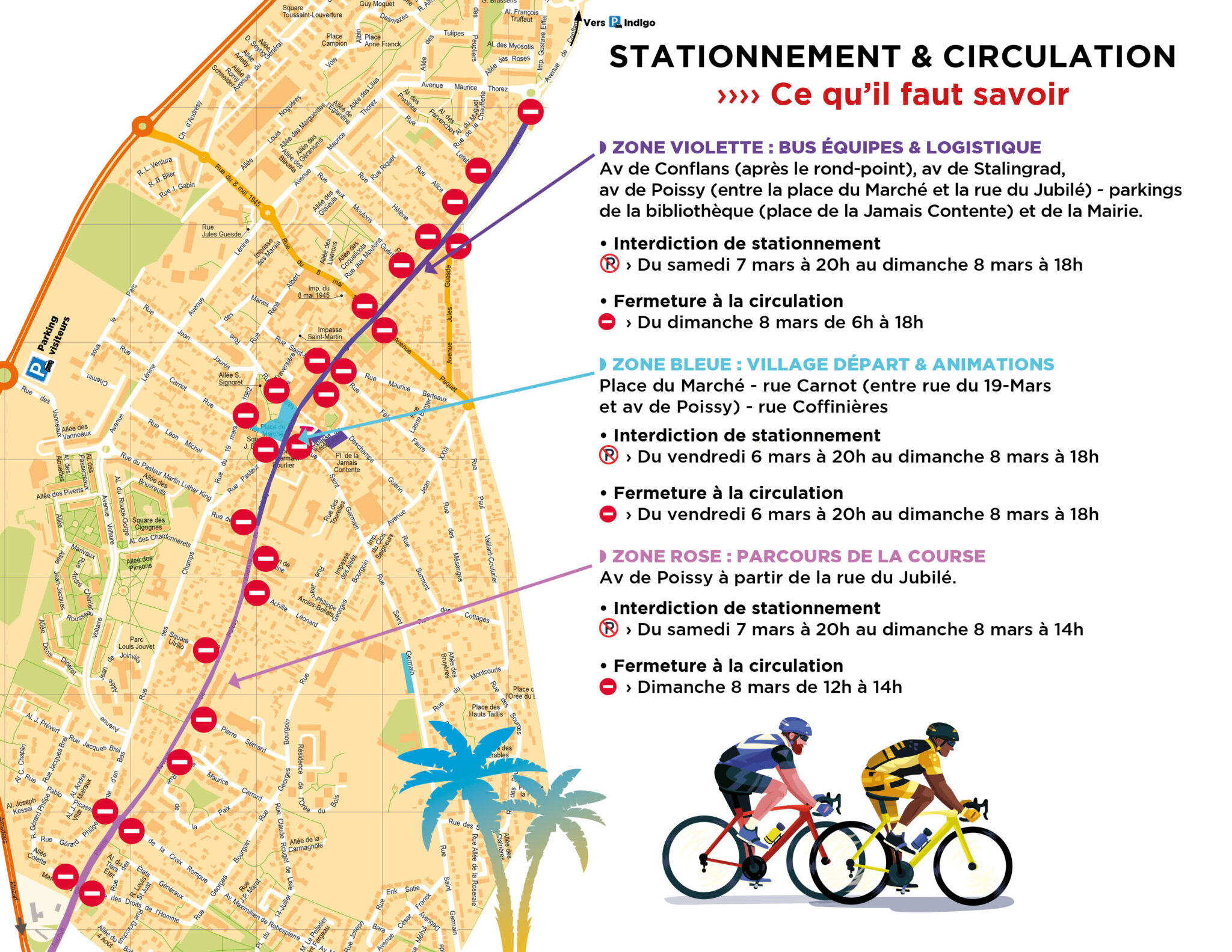 Bus équipes et logistique > avenue de Conflans (après le rond-point), avenue de Stalingrad, avenue de Poissy (entre la Place du Marché et la rue du Jubilé), parkings de la bibliothèque et de la mairie