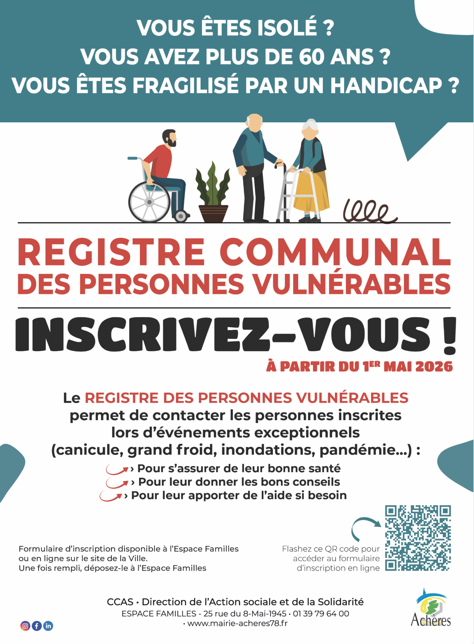 Le CCAS d’Achères tient un registre des personnes vulnérables afin de leur apporter soutien et assistance en cas de risques exceptionnels (canicule, grand froid, épidémie…). Ce registre permet d’assurer une veille sociale et de prodiguer des conseils sanitaires. Toutes les informations recueillies sont strictement confidentielles.