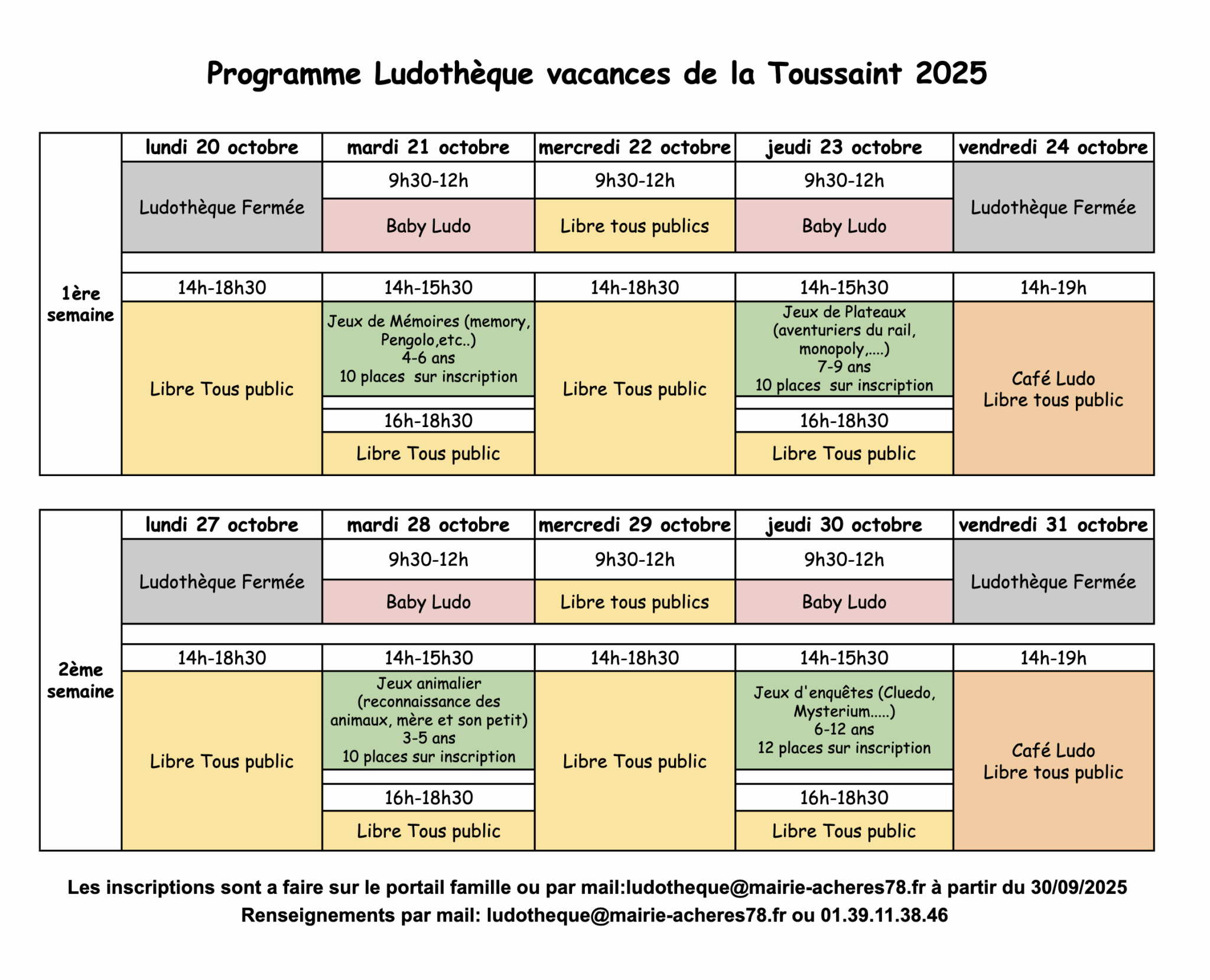 Retrouvez le programme de la Ludothèque d’Achères durant les vacances de la Toussaint, du lundi 20 au vendredi 31 octobre. De nombreuses activités pour toutes les tranches d’âges !