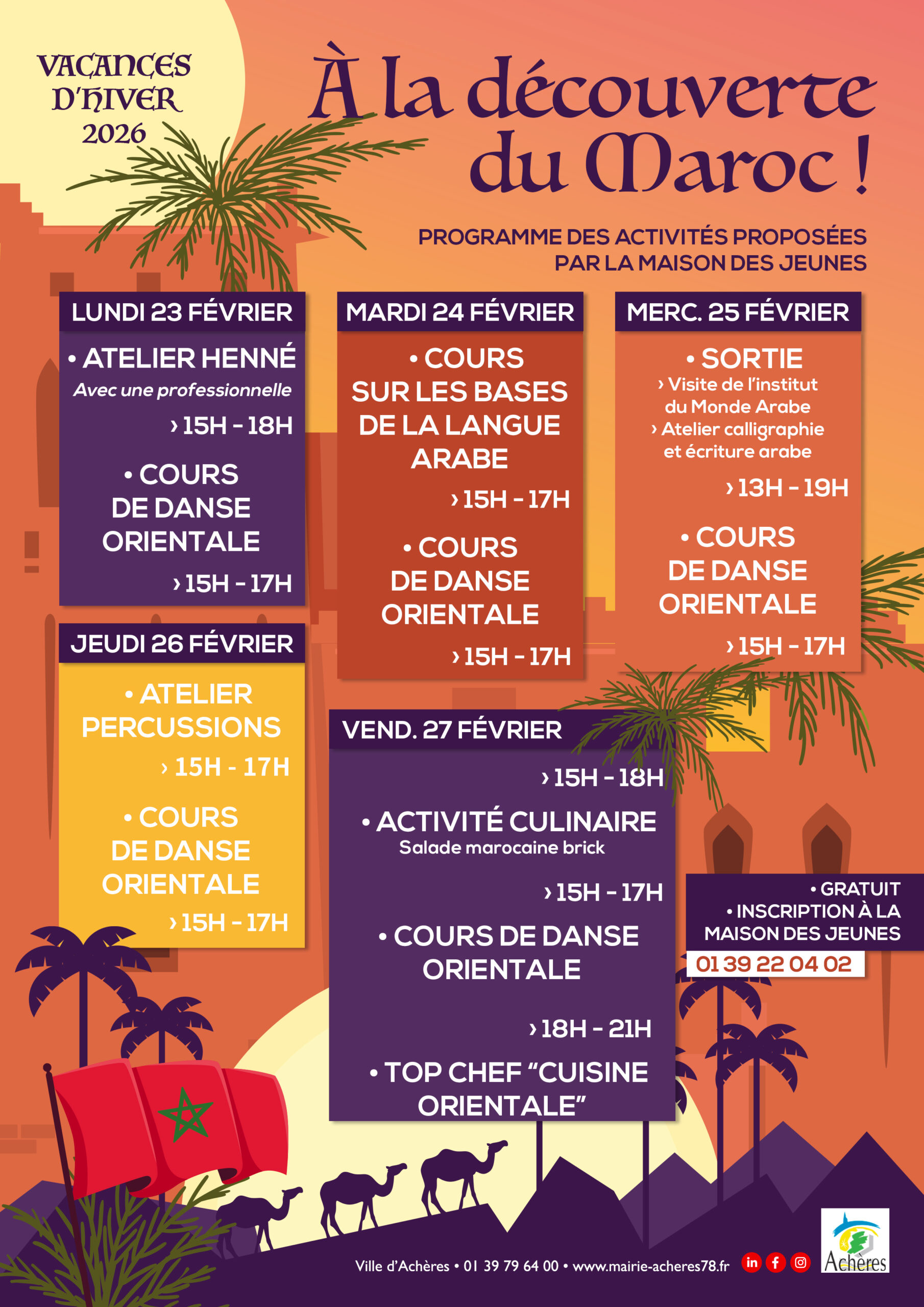 Du lundi 23 février au vendredi 27 février, la première semaine sera placée sous le signe du Maroc. Au programme : animations, découvertes culturelles et activités autour des traditions marocaines.